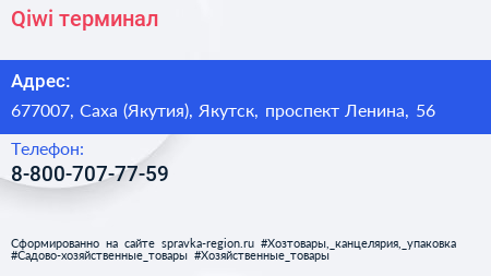 Qiwi, терминал по адресу 677007, Саха (Якутия), Якутск, проспект Ленина, 56 в дальнейшем Организация, размещена в следующих категориях: