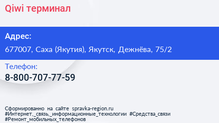 Qiwi, терминал по адресу 677007, Саха (Якутия), Якутск, Дежнёва, 75/2 в дальнейшем Организация, размещена в следующих категориях: