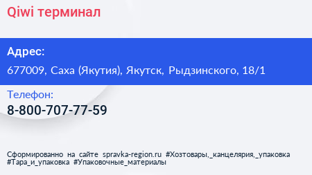 Qiwi, терминал по адресу 677009, Саха (Якутия), Якутск, Рыдзинского, 18/1 в дальнейшем Организация, размещена в следующих категориях: