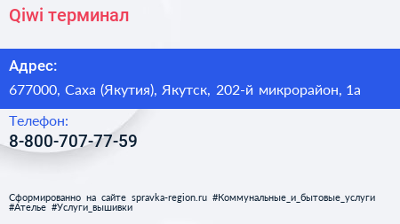 Qiwi, терминал по адресу 677000, Саха (Якутия), Якутск, 202-й микрорайон, 1а в дальнейшем Организация, размещена в следующих категориях: