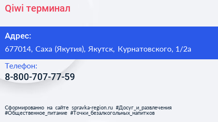 Qiwi, терминал по адресу 677014, Саха (Якутия), Якутск, Курнатовского, 1/2а в дальнейшем Организация, размещена в следующих категориях: