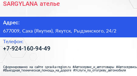 SARGYLANA, ателье по адресу 677009, Саха (Якутия), Якутск, Рыдзинского, 24/2 в дальнейшем Организация, размещена в следующих категориях: