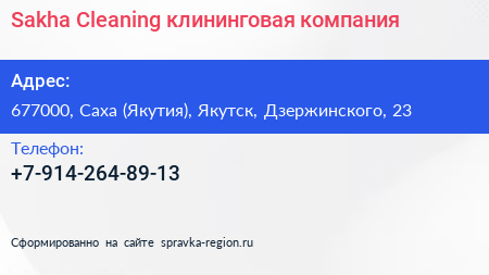 Sakha Cleaning, клининговая компания по адресу 677000, Саха (Якутия), Якутск, Дзержинского, 23 в дальнейшем Организация, размещена в следующих категориях:
