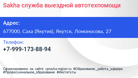 Sakha, служба выездной автотехпомощи по адресу 677000, Саха (Якутия), Якутск, Ломоносова, 27 в дальнейшем Организация, размещена в следующих категориях: