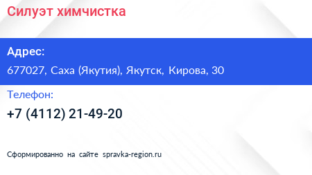 Силуэт, химчистка по адресу 677027, Саха (Якутия), Якутск, Кирова, 30 в дальнейшем Организация, размещена в следующих категориях: