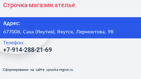 Строчка, магазин-ателье по адресу 677008, Саха (Якутия), Якутск, Лермонтова, 98 в дальнейшем Организация, размещена в следующих категориях: