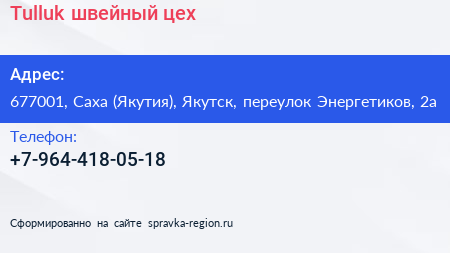 Tulluk, швейный цех по адресу 677001, Саха (Якутия), Якутск, переулок Энергетиков, 2а в дальнейшем Организация, размещена в следующих категориях:
