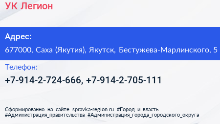 УК Легион по адресу 677000, Саха (Якутия), Якутск, Бестужева-Марлинского, 5 в дальнейшем Организация, размещена в следующих категориях: