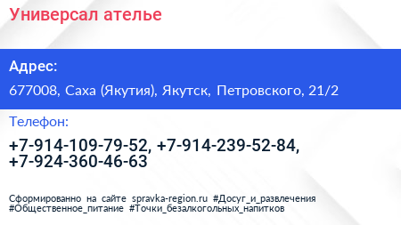 Универсал, ателье по адресу 677008, Саха (Якутия), Якутск, Петровского, 21/2 в дальнейшем Организация, размещена в следующих категориях: