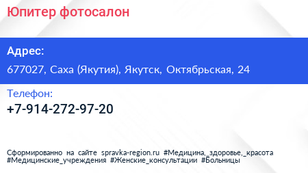 Юпитер, фотосалон по адресу 677027, Саха (Якутия), Якутск, Октябрьская, 24 в дальнейшем Организация, размещена в следующих категориях: