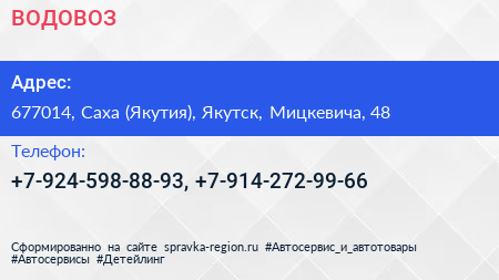 ВОДОВОЗ по адресу 677014, Саха (Якутия), Якутск, Мицкевича, 48 в дальнейшем Организация, размещена в следующих категориях: