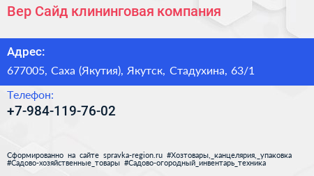 Вер-Сайд, клининговая компания по адресу 677005, Саха (Якутия), Якутск, Стадухина, 63/1 в дальнейшем Организация, размещена в следующих категориях: