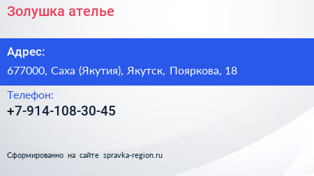 Золушка, ателье по адресу 677000, Саха (Якутия), Якутск, Пояркова, 18 в дальнейшем Организация, размещена в следующих категориях: