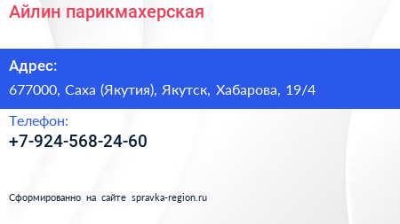 Айлин, парикмахерская по адресу 677000, Саха (Якутия), Якутск, Хабарова, 19/4 в дальнейшем Организация, размещена в следующих категориях: