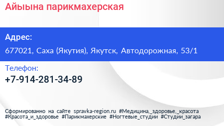 Айыына, парикмахерская по адресу 677021, Саха (Якутия), Якутск, Автодорожная, 53/1 в дальнейшем Организация, размещена в следующих категориях: