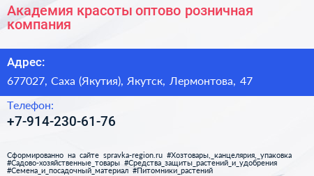 Академия красоты, оптово-розничная компания по адресу 677027, Саха (Якутия), Якутск, Лермонтова, 47 в дальнейшем Организация, размещена в следующих категориях: