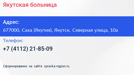 Якутская больница по адресу 677000, Саха (Якутия), Якутск, Северная улица, 10а в дальнейшем Организация, размещена в следующих категориях: