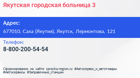 Якутская городская больница №3 по адресу 677010, Саха (Якутия), Якутск, Лермонтова, 121 в дальнейшем Организация, размещена в следующих категориях: