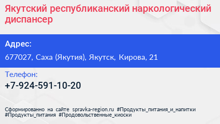 Якутский республиканский наркологический диспансер по адресу 677027, Саха (Якутия), Якутск, Кирова, 21 в дальнейшем Организация, размещена в следующих категориях: