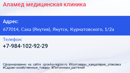 Аламед, медицинская клиника по адресу 677014, Саха (Якутия), Якутск, Курнатовского, 1/2а в дальнейшем Организация, размещена в следующих категориях: