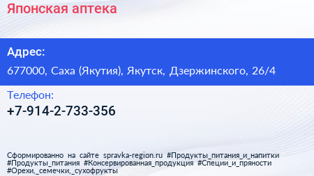Японская аптека по адресу 677000, Саха (Якутия), Якутск, Дзержинского, 26/4 в дальнейшем Организация, размещена в следующих категориях: