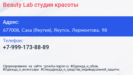 Beauty Lab, студия красоты по адресу 677008, Саха (Якутия), Якутск, Лермонтова, 98 в дальнейшем Организация, размещена в следующих категориях: