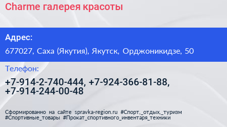 Charme, галерея красоты по адресу 677027, Саха (Якутия), Якутск, Орджоникидзе, 50 в дальнейшем Организация, размещена в следующих категориях: