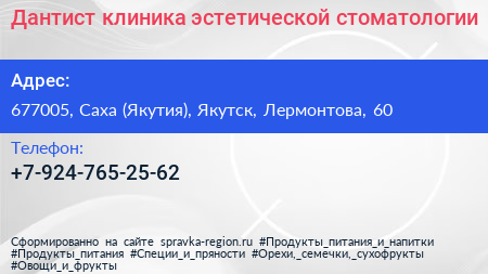 Дантист, клиника эстетической стоматологии по адресу 677005, Саха (Якутия), Якутск, Лермонтова, 60 в дальнейшем Организация, размещена в следующих категориях: