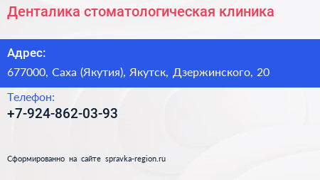 Денталика, стоматологическая клиника по адресу 677000, Саха (Якутия), Якутск, Дзержинского, 20 в дальнейшем Организация, размещена в следующих категориях: