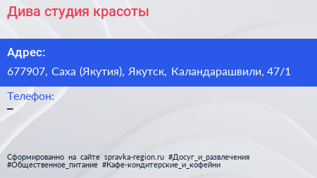 Дива, студия красоты по адресу 677907, Саха (Якутия), Якутск, Каландарашвили, 47/1 в дальнейшем Организация, размещена в следующих категориях: