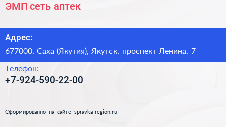 ЭМП, сеть аптек по адресу 677000, Саха (Якутия), Якутск, проспект Ленина, 7 в дальнейшем Организация, размещена в следующих категориях: