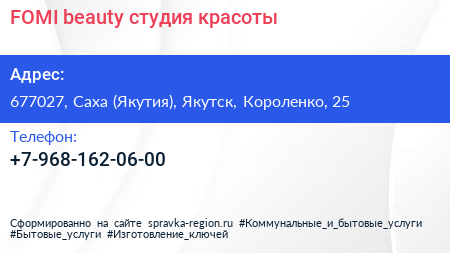 FOMI beauty, студия красоты по адресу 677027, Саха (Якутия), Якутск, Короленко, 25 в дальнейшем Организация, размещена в следующих категориях: