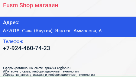 Fusm Shop, магазин по адресу 677018, Саха (Якутия), Якутск, Аммосова, 6 в дальнейшем Организация, размещена в следующих категориях: