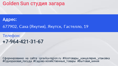 Golden Sun, студия загара по адресу 677902, Саха (Якутия), Якутск, Гастелло, 19 в дальнейшем Организация, размещена в следующих категориях: