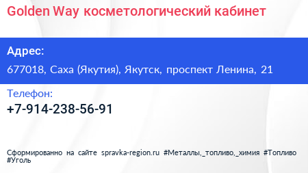 Golden Way, косметологический кабинет по адресу 677018, Саха (Якутия), Якутск, проспект Ленина, 21 в дальнейшем Организация, размещена в следующих категориях: