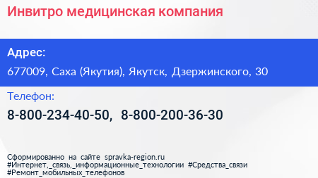 Инвитро, медицинская компания по адресу 677009, Саха (Якутия), Якутск, Дзержинского, 30 в дальнейшем Организация, размещена в следующих категориях:
