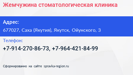 Жемчужина, cтоматологическая клиника по адресу 677027, Саха (Якутия), Якутск, Ойунского, 3 в дальнейшем Организация, размещена в следующих категориях: