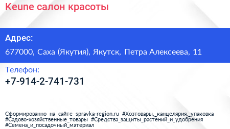 Keune, салон красоты по адресу 677000, Саха (Якутия), Якутск, Петра Алексеева, 11 в дальнейшем Организация, размещена в следующих категориях: