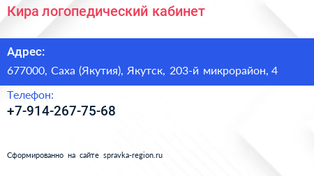 Кира, логопедический кабинет по адресу 677000, Саха (Якутия), Якутск, 203-й микрорайон, 4 в дальнейшем Организация, размещена в следующих категориях: