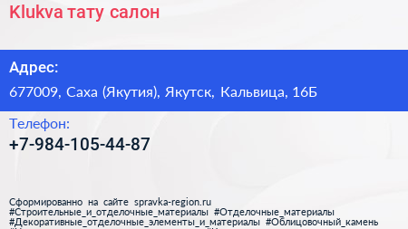 Klukva, тату-салон по адресу 677009, Саха (Якутия), Якутск, Кальвица, 16Б в дальнейшем Организация, размещена в следующих категориях: