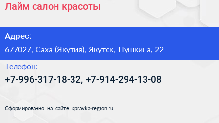 Лайм, салон красоты по адресу 677027, Саха (Якутия), Якутск, Пушкина, 22 в дальнейшем Организация, размещена в следующих категориях: