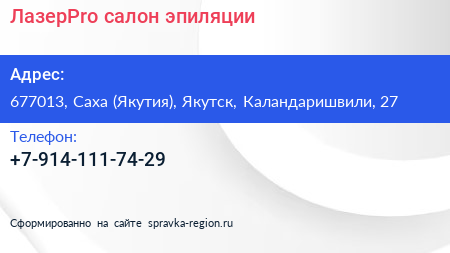ЛазерPro, салон эпиляции по адресу 677013, Саха (Якутия), Якутск, Каландаришвили, 27 в дальнейшем Организация, размещена в следующих категориях: