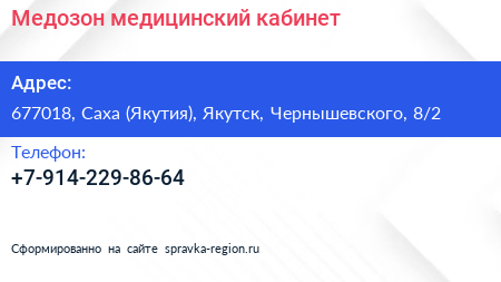 Медозон, медицинский кабинет по адресу 677018, Саха (Якутия), Якутск, Чернышевского, 8/2 в дальнейшем Организация, размещена в следующих категориях: