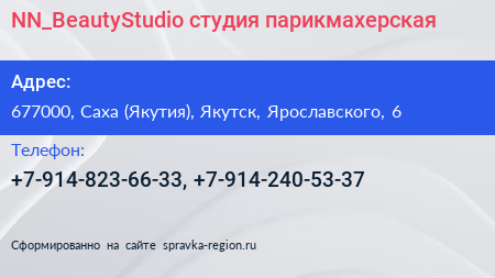 NN_BeautyStudio, студия-парикмахерская по адресу 677000, Саха (Якутия), Якутск, Ярославского, 6 в дальнейшем Организация, размещена в следующих категориях: