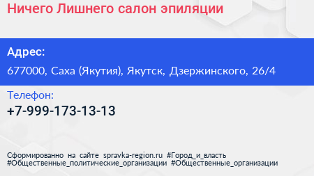 Ничего Лишнего, салон эпиляции по адресу 677000, Саха (Якутия), Якутск, Дзержинского, 26/4 в дальнейшем Организация, размещена в следующих категориях:
