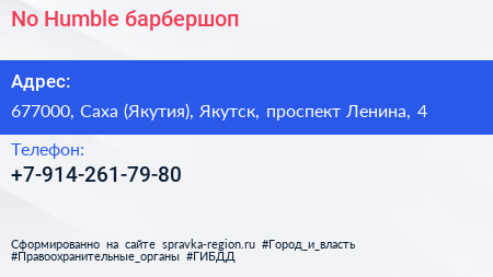 No Humble, барбершоп по адресу 677000, Саха (Якутия), Якутск, проспект Ленина, 4 в дальнейшем Организация, размещена в следующих категориях: