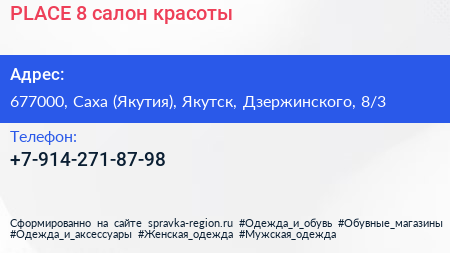 PLACE 8, салон красоты по адресу 677000, Саха (Якутия), Якутск, Дзержинского, 8/3 в дальнейшем Организация, размещена в следующих категориях: