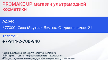 PROMAKE UP, магазин ультрамодной косметики по адресу 677000, Саха (Якутия), Якутск, Орджоникидзе, 21 в дальнейшем Организация, размещена в следующих категориях: