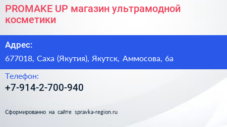 PROMAKE UP, магазин ультрамодной косметики по адресу 677018, Саха (Якутия), Якутск, Аммосова, 6а в дальнейшем Организация, размещена в следующих категориях: