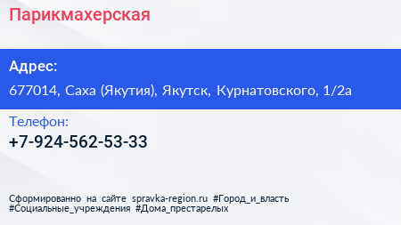 Парикмахерская по адресу 677014, Саха (Якутия), Якутск, Курнатовского, 1/2а в дальнейшем Организация, размещена в следующих категориях: